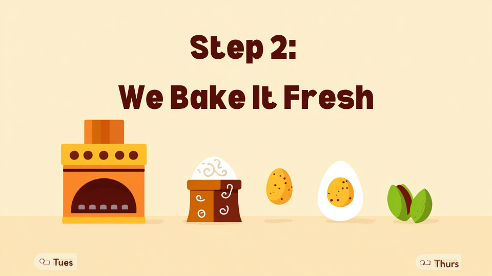 What if you order on another day? No problem! Your order will simply be scheduled for the next available bake day. For example, an order placed on a Friday will be freshly baked for you on the following Tuesday.