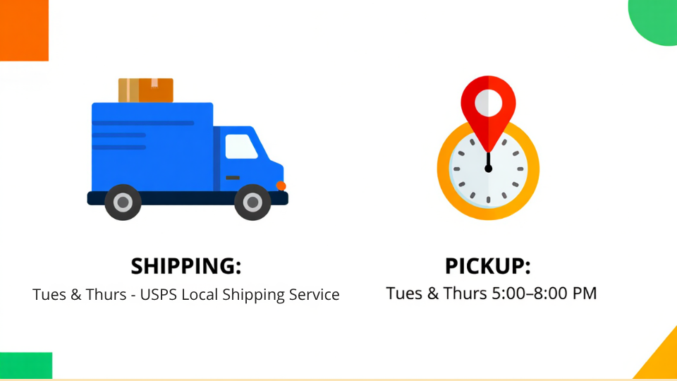 • For Local Pickup: You will receive a notification that your order is ready for pickup in Lake Wales, FL. Our pickup window is on Tuesdays and Thursdays from 5:00 PM to 8:00 PM. Please remember to book your 15-minute favorite time slot using the calendar provided on checkout.